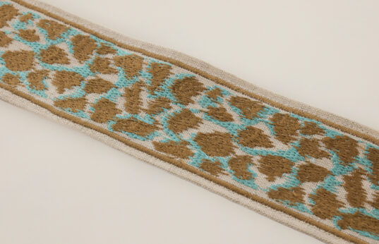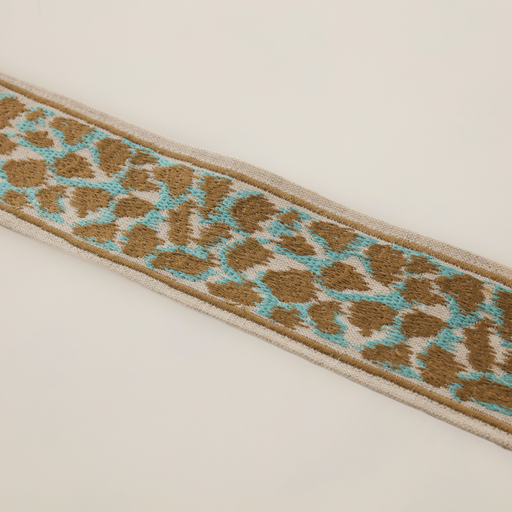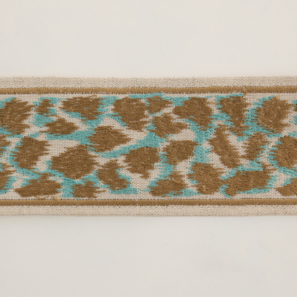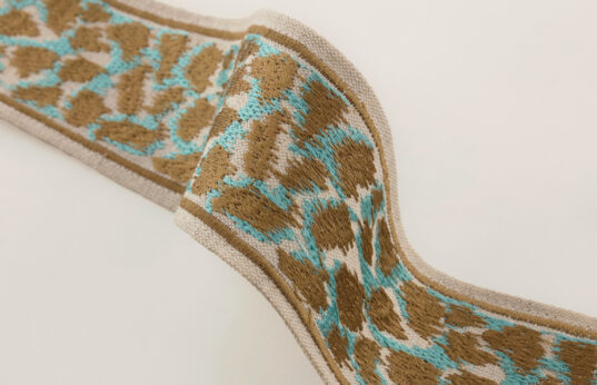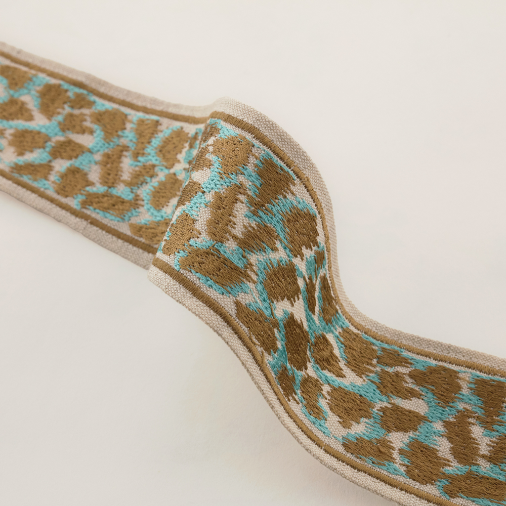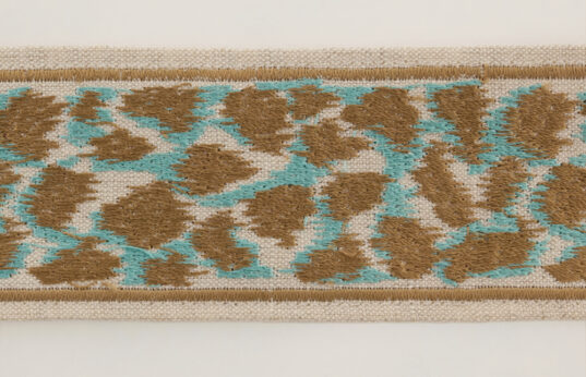 Our camouflage braid in gorgeous turquoise and taupe offers a unique and modern twist to a traditional design creating a sophisticated edge to any bridge cloth.
